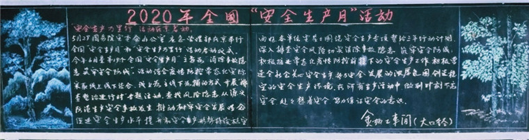 为了做好“安全生产月”活动的宣传工作,公司办公室宣传员积极搜集、整理安全月活动资料,并及时下发给车间进行黑板报宣传和学习,车间黑板报以主题鲜明、版面新颖、形式多样、内容丰富等形式广泛宣传了党和国家安全生产法律法规、方针政策和公司管理制度,以及安全生产技术知识,推动全员牢固树立“科学发展、安全发展”的理念,为“安全生产月”活动的顺利开展做好了铺垫,营造了良好的活动氛围。
