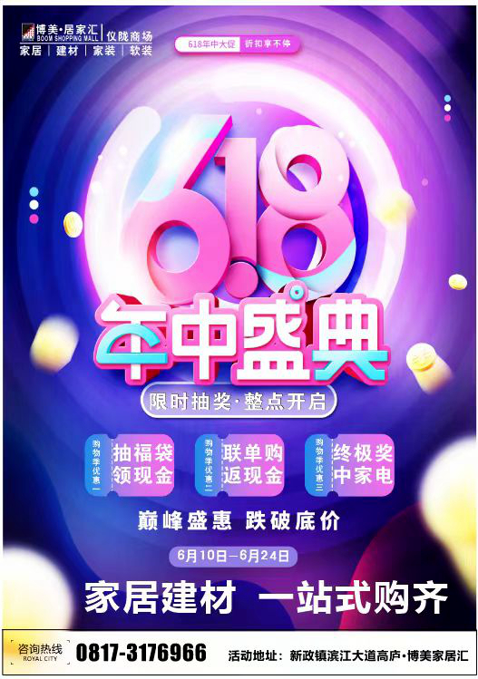 从6月10日至6月24日,“618年中盛典”活动包括下单砸金蛋、厂家联购、收官返现、618狂欢无购物抽奖、新家好运、红包有礼、终极抽大奖等,让广大消费者感受了丰富多彩,应有尽有之盛况。