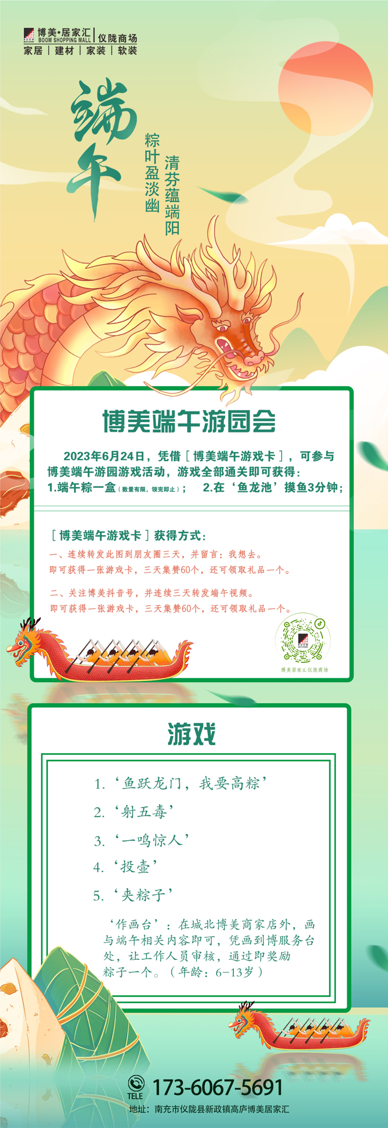 6月端午佳节,为迎祥纳福、祛邪除灾,博美携手场内商家举办了盛大的端午游园活动。此次活动不仅为本次年中盛典吸引人流、带动消费,也让顾客通过转发抖音视频、转发现场照片(或订单)至朋友圈的方式提高了商场知名度,同时游园会上丰富多彩的“射五毒”、“投壶”、“一鸣惊人”等一系列中华传统游戏能让孩子们通过寓教于乐的方式感受到中国传统文化的博大精深,孩子与家长的共同参与更是温馨的亲子互动,爸爸们参加游戏时分秒必争的样子,会让今年的父亲节变得更有乐趣和意义。