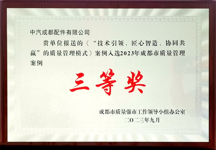 中汽成配分管副总邹祖力表示:此次获得成都市质量管理案例三等奖,是对中汽成配团队不懈努力和执着追求的肯定,我们还要感谢成都市质量强市工作领导小组办公室对中汽成配的认可和支持,他们一直在推动成都企业的质量管理工作,促进行业的良性发展。这个奖项的获得将进一步激励我们,努力提升自身实力,为客户提供更优质的产品和服务。未来,中汽成配将继续秉承品质至上的理念,不断加强质量管理,推动创新,提高竞争力,在成都市乃至全国范围内树立良好的企业形象。