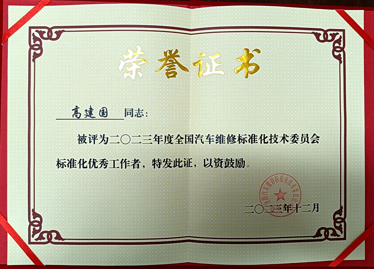 图 | “全国汽车维修标准化优秀工作者”荣誉证书