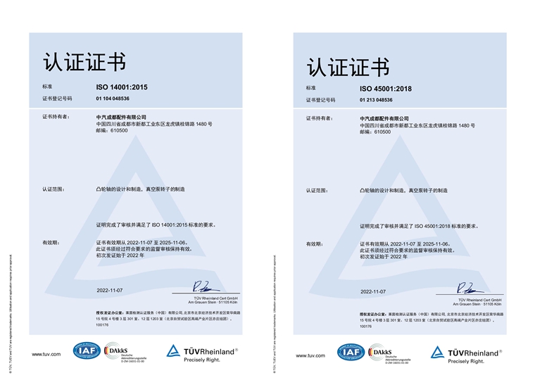 EHS体系认证是企业在环境、健康和安全管理方面的国际认可标准。审核过程包括了对车间及各职能部门的个体防护装备、工具和设备安全、人机工程、作业环境、人员管理、制度与程序等方面的严格审核。中汽成配在完成不符合项跟踪及验证后,收到了莱茵公司颁布的ISO14001、ISO45001认证证书。通过这一认证意味着中汽成配在这些领域达到了国际先进水平。