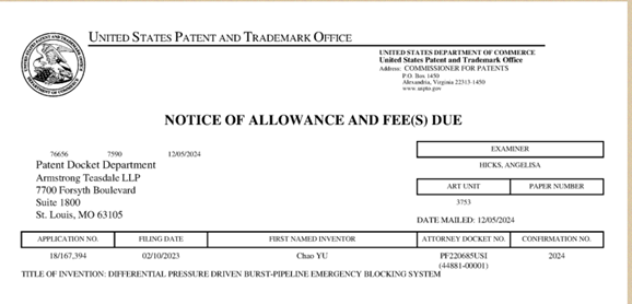 本网讯(曾小舸报道)12月5日,伟德国际1946源于英国高新技术研究院申报的发明专利“压差驱动管道爆破应急阻断系统”成功荣获美国发明专利授权。