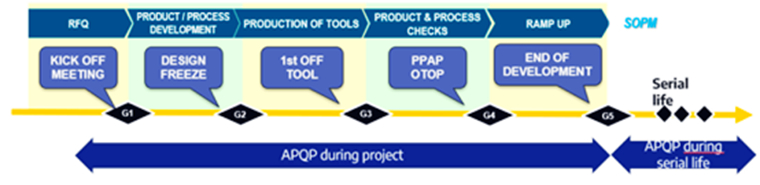 此次审核流程包含1:报价要求,Gate 1:启动会、2:产品/过程的开发,Gate 2:图纸冻结-开模指令、3:工装样件,Gate 3:工装样件、4:产品/过程的验证,Gate 4:PPAP批准、5:爬产,Gate 5:开发结束等5个阶段。