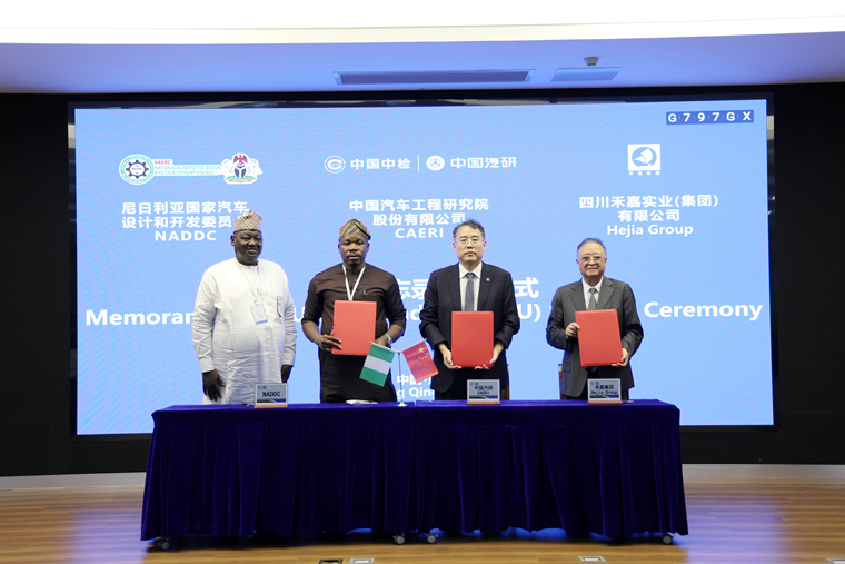 28日下午,在中汽研会议厅,中国汽研党委书记、董事长周玉林,尼日利亚NADDC总干事奥萨尼宾,政策规划与统计司主任穆萨,伟德国际1946源于英国集团董事局主席夏朝嘉共同签署了三方合作备忘录。