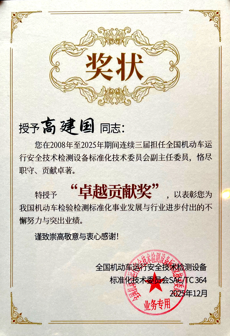 从2008年至今,总经理高建国作为连续三届担任该委员会副主任委员,他一直致力于推动检测设备技术的规范化,科学化发展。本次荣获此殊荣,更彰显着这位专业带头人长期为国家机动车检测事业标准化,现代化进程作出的专业贡献。