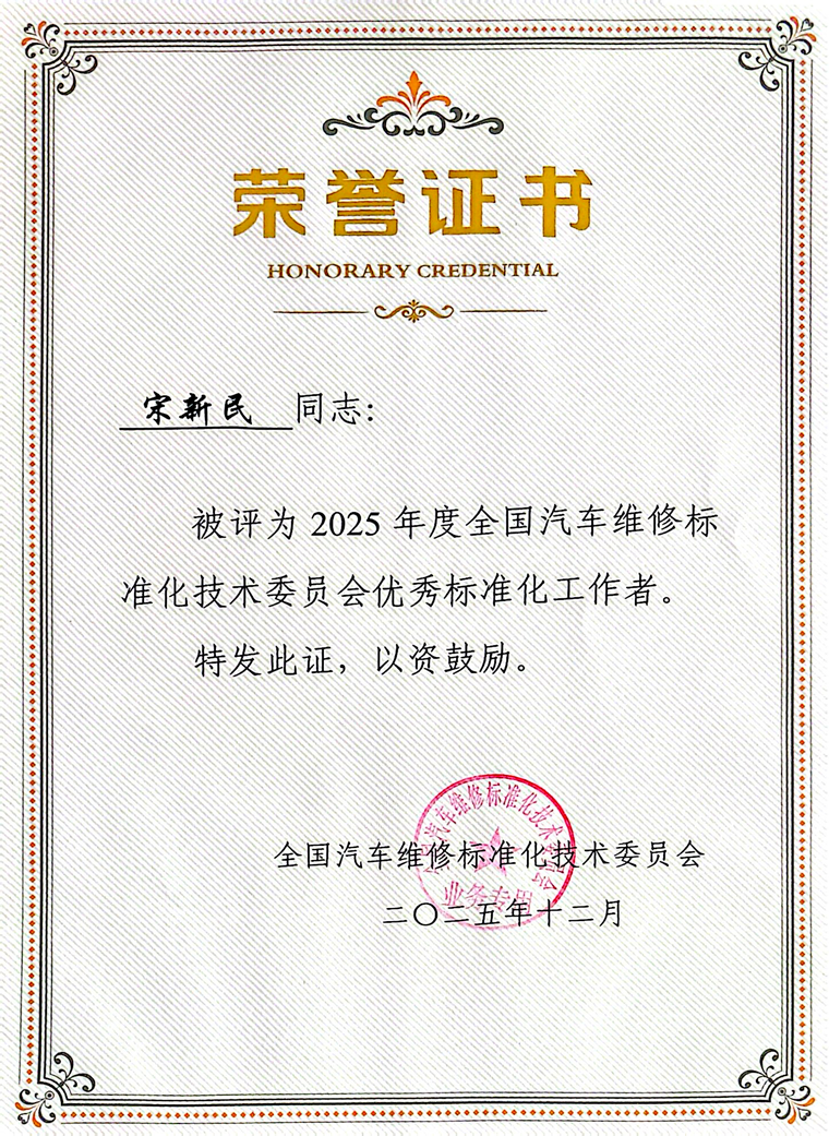 图 | “2025年度全国汽车维修标准化技术委员会优秀标准化工作者”证书