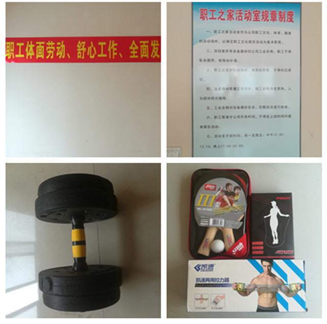 在活动室的建设过程中,公司领导本着为员工着想,服务员工的原则,从有限的经费中拨出专项资金,用于购置各类棋牌及健身器材。活动室位于员工宿舍的二楼。室内摆放有围棋、象棋、乒乓球、羽毛球、跳绳、哑铃等器材。在工作闲暇之时,员工可以进行一下体育竞技,既强身健体,又利于员工团结。