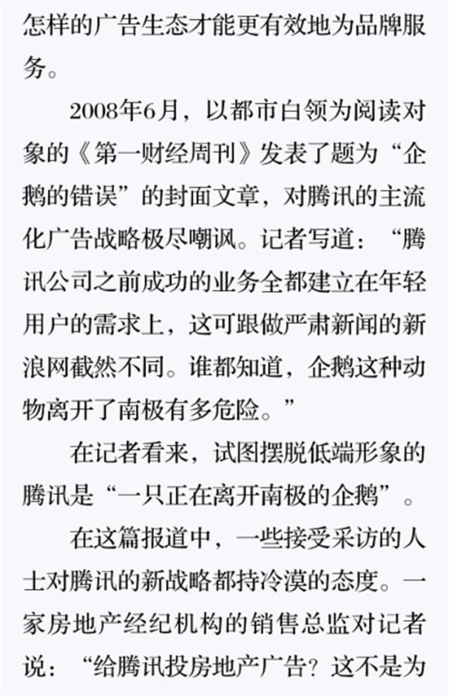 深读之后发现,其实全书真正的核心在于透过腾讯可以观察到的中国企业逻辑,其中很多基于国情而诞生的特殊能力,过去或受诟病或被追捧,而本书作者可以以更加客观的姿态对其进行分析,这无疑是一种当代创业者和企业家应当学习的姿态和能力。