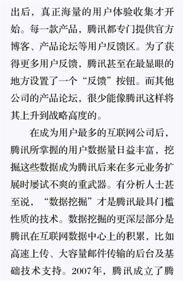 深读之后发现,其实全书真正的核心在于透过腾讯可以观察到的中国企业逻辑,其中很多基于国情而诞生的特殊能力,过去或受诟病或被追捧,而本书作者可以以更加客观的姿态对其进行分析,这无疑是一种当代创业者和企业家应当学习的姿态和能力。