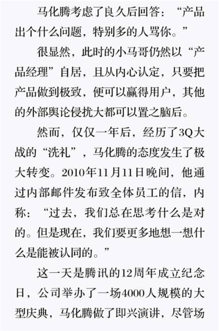 深读之后发现,其实全书真正的核心在于透过腾讯可以观察到的中国企业逻辑,其中很多基于国情而诞生的特殊能力,过去或受诟病或被追捧,而本书作者可以以更加客观的姿态对其进行分析,这无疑是一种当代创业者和企业家应当学习的姿态和能力。