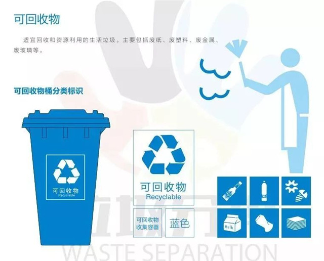蓝色代表可回收:是指经过加工可以成为生产原料或者经过整理可以再利用的物品,主要包括废纸、塑料、金属、玻璃等。