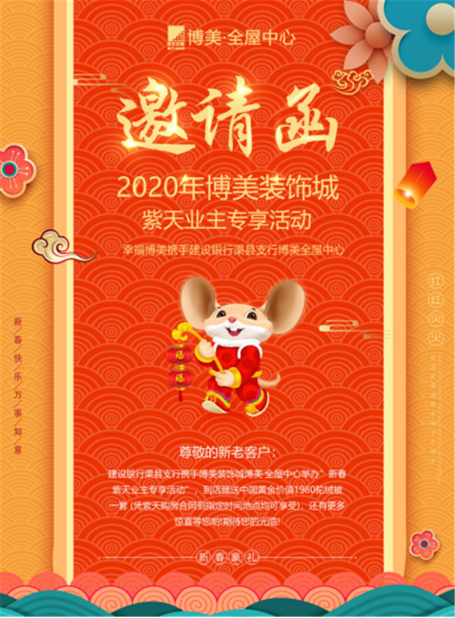 为了消费者温馨舒适的家,“博美•全屋中心”配备了优秀的销售、设计、施工、交付及金融服务团队,同时携手建材家居行业多家实力品牌厂家和施工企业,为消费者提供全面、高效、优质、省时、省心的“一站式”消费服务。为庆祝开业,“博美﹒全屋中心”渠县店开业钜惠,联合建设银行渠县支行为客户提供专享金融服务,幸福博美与您一起过福年。