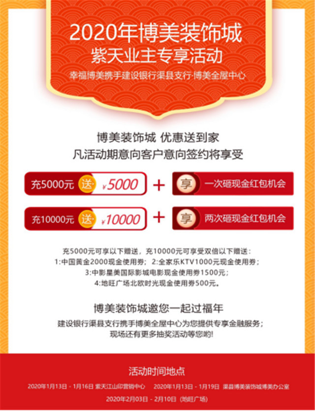 为回馈广大消费者对博美的信赖,渠县“博美﹒全屋中心”携手建设银行渠县支行于前不久开展了主题为“新春紫天业主专享活动”,活动内容包含:一、到店即送中国黄金价值1980元驼绒被一套(凭紫天购房合同到指定时间地点均可享受)。二、意向客户意向签约将享受充5000元送5000元并享一次砸现金红包机会、充10000元送10000 元并享砸两次现金红包机会。三、充5000元可享以下赠送,充10000元可享受双倍以下赠送:1.中国黄金2000元现金使用券;2.全家乐KTV1000元现金使用劵;3.中影星美国际影城电影现金使用券1500元;4.地旺广场北欧时光现金使用券500元。